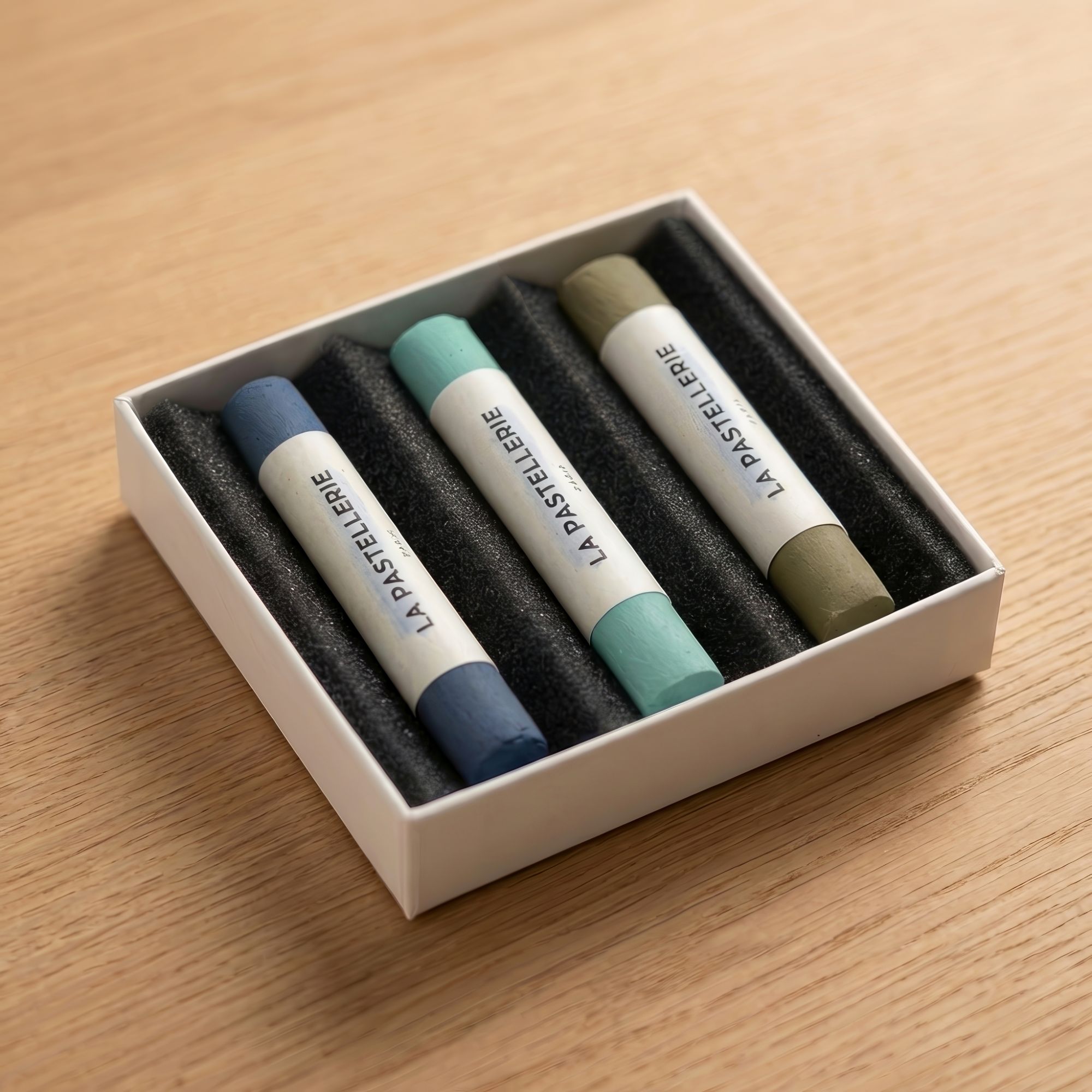 3 pastels secs artisanaux inspirés des paysages boréaux : bleu marine, vert menthe et vert minéral.