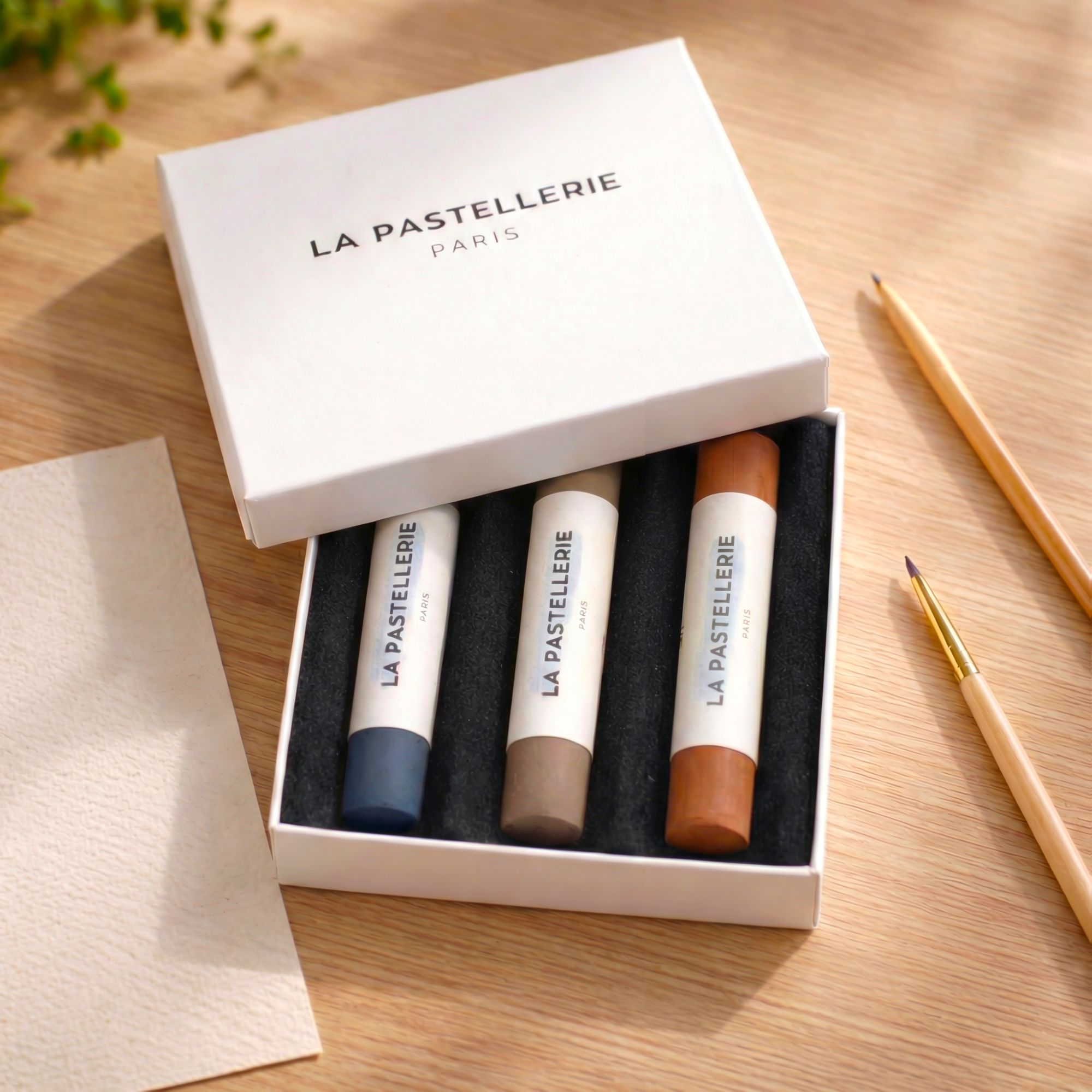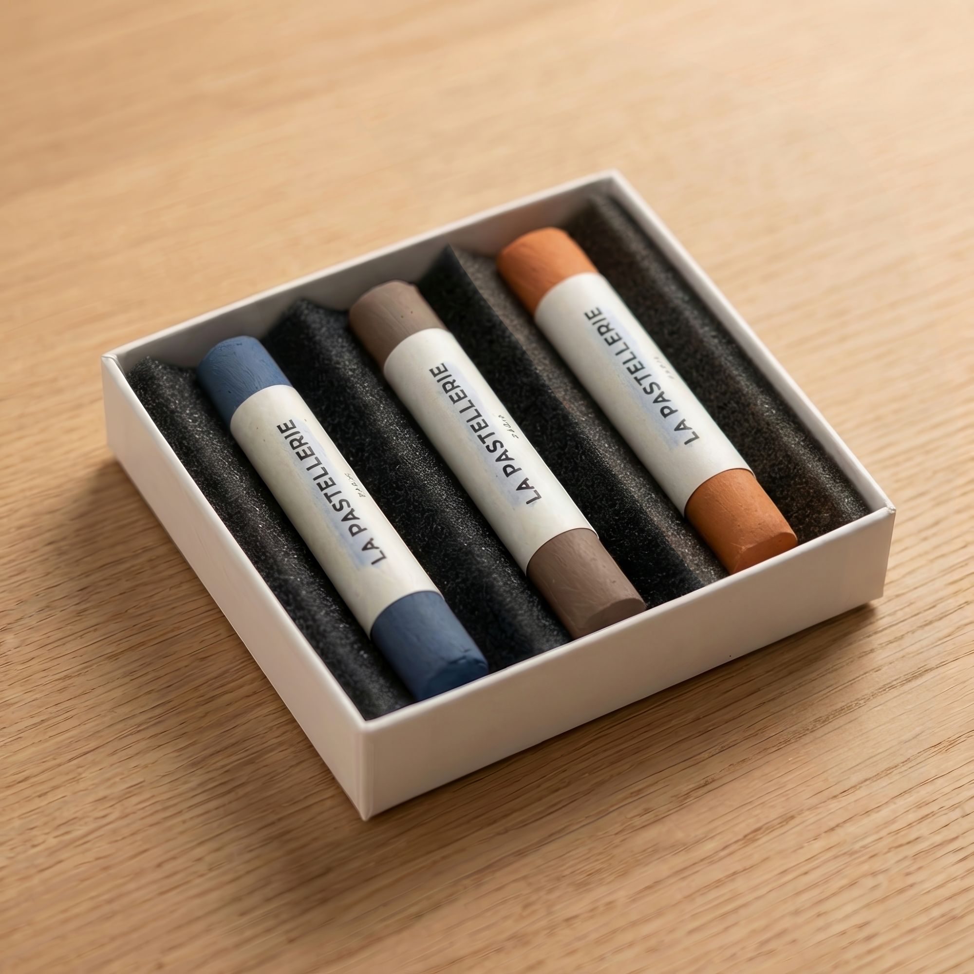 Chaque pastel est façonné à la main dans notre atelier en France, avec une forte concentration en pigments pour un rendu intense et durable. Leur texture permet une estompe fluide, des superpositions harmonieuses et un travail précis des détails.