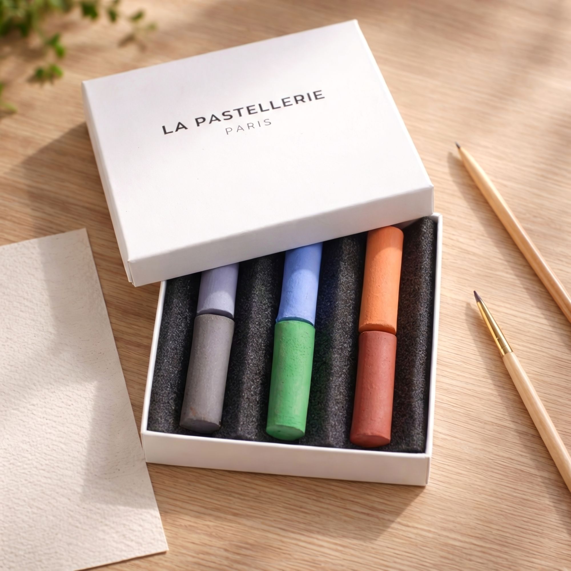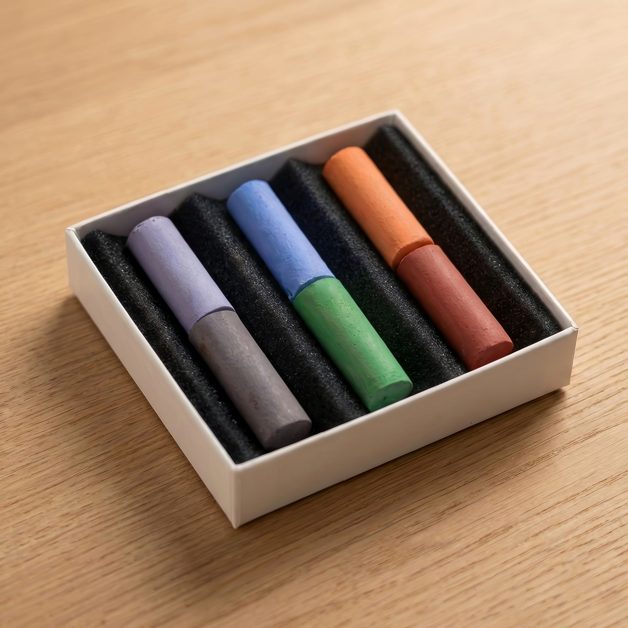 Coffret de 6 demi-bâtons secs artisanaux aux nuances raffinées (violets, bleu poudré, vert de chrome, abricot rosé, rouge grenade). Pigments intenses, estompe et superposition faciles.