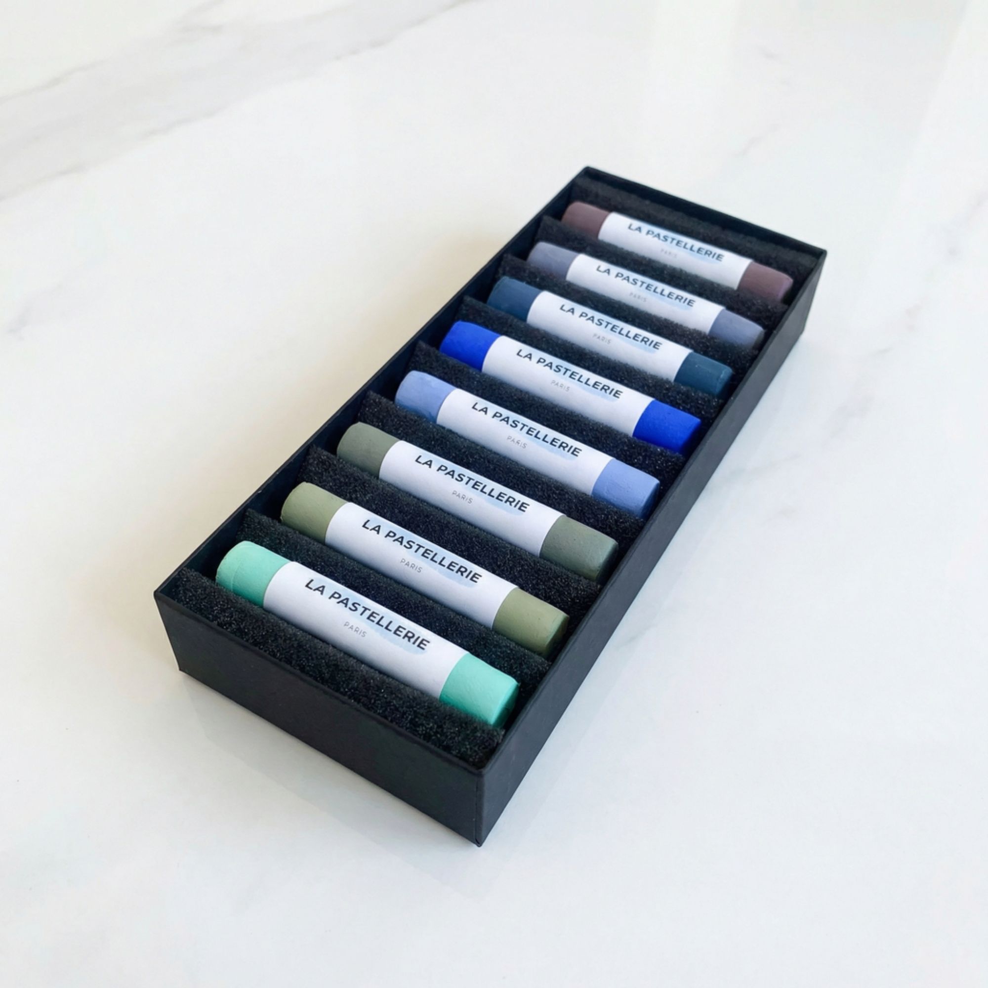 8 pastels secs artisanaux aux nuances hivernales et brumeuses. Pigments intenses, estompe facile, fabrication artisanale française.